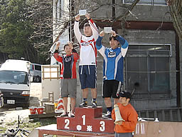 ←十両クラス 1位:原口美星ちゃん 2位:中のまさこさん 3位:橋本采音ちゃん 十両クラスの表彰台を制したのはなんと三人とも女の子!残りの参加者はみな男の子なんですがね…。バイクトライアル界にも女性上位時代がくるか?(笑) |
